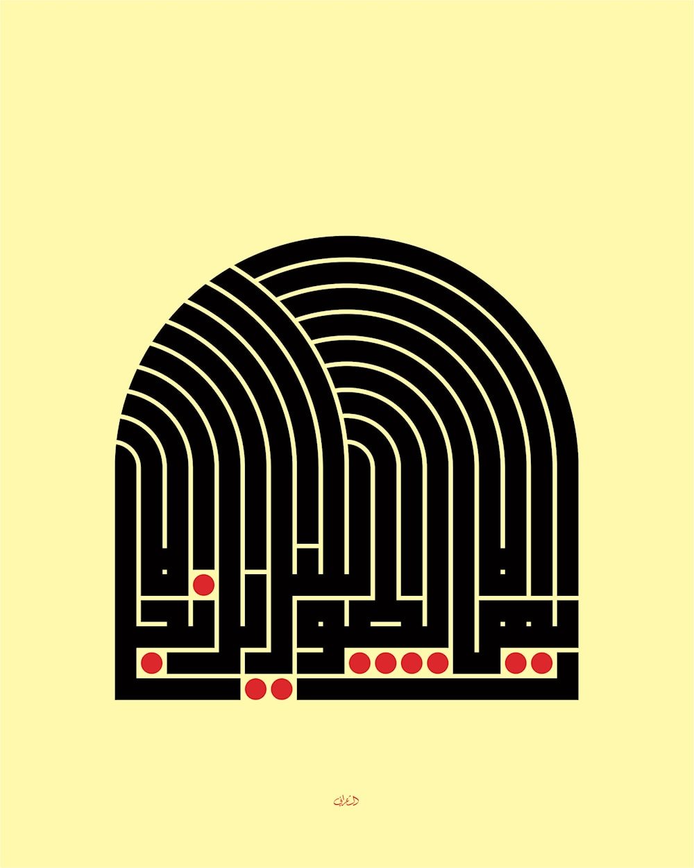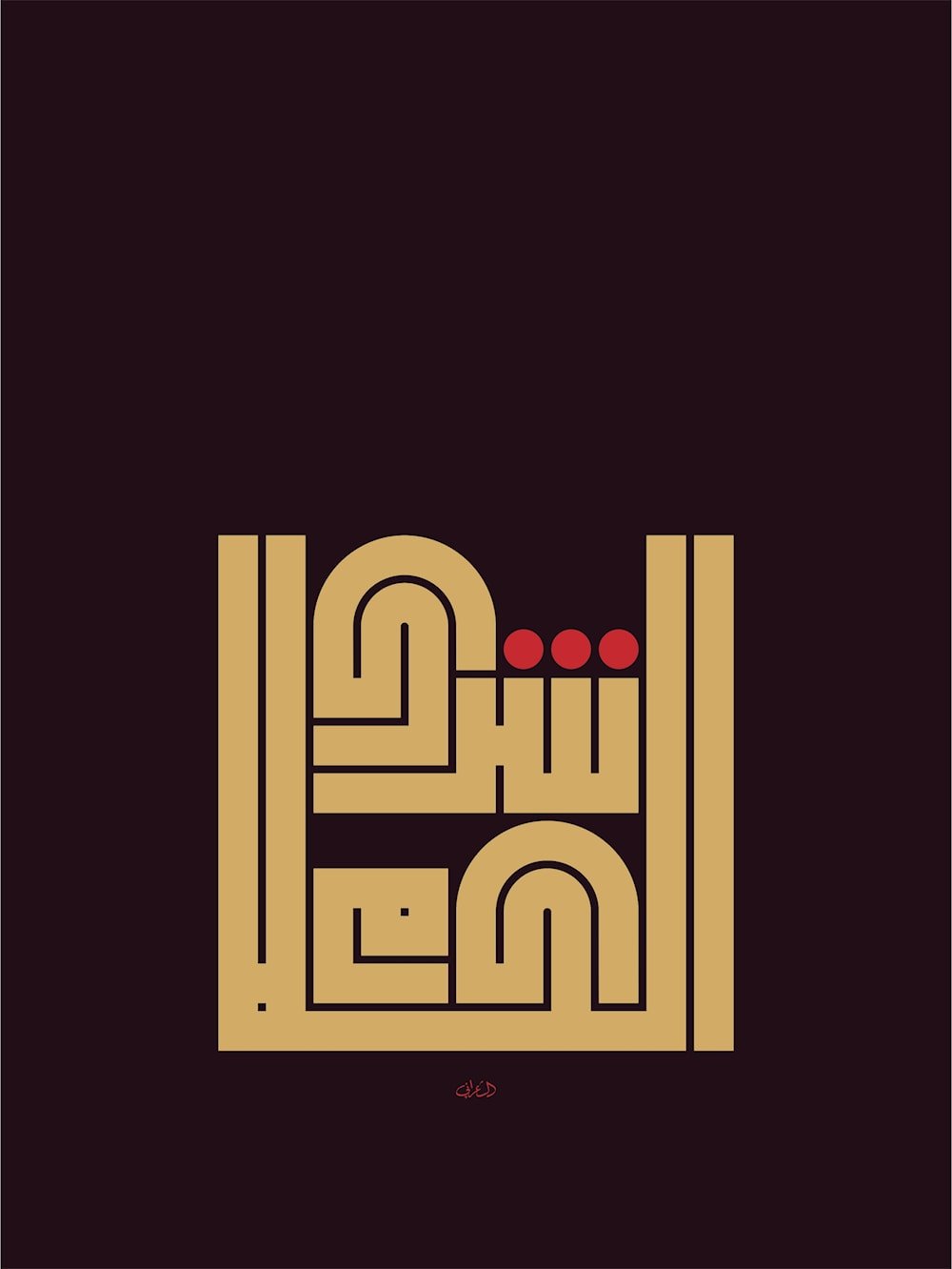 هكذا، تبدو العبارة كما لو أنّها متاهة، لولا استخدام النقاط التي تشع بالأحمر وسط العتمة المطلقة. لكنّه في مقترح آخر للعبارة عينها، يجد حلولاً بصرية أخرى باستخدام انسيابية حرفي الألف واللام واستطالاتهما، فتنشأ كتلة في الفراغ تحيل إلى استغاثة وربما صرخة في العراء.