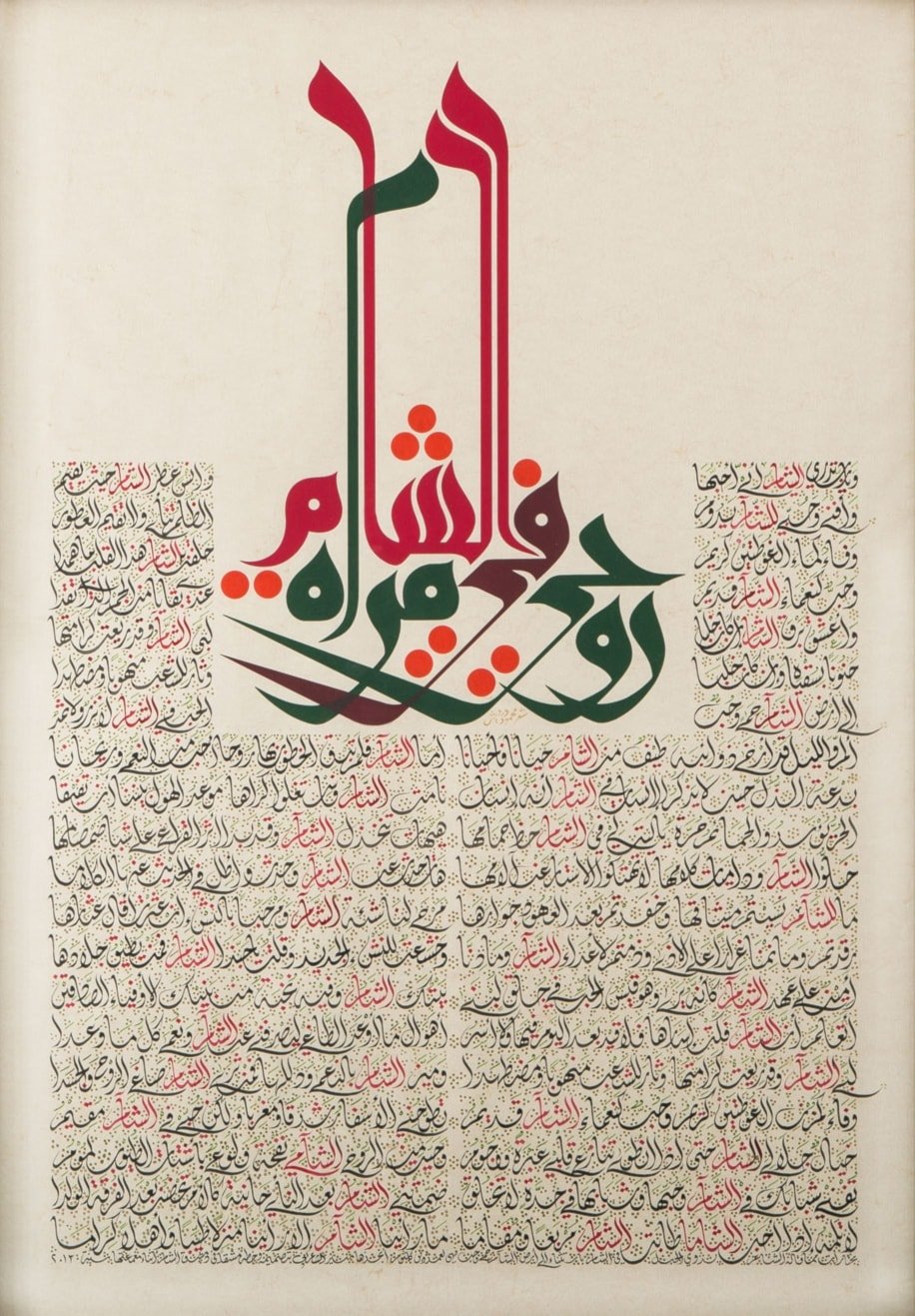 نخرج من معرض منير الشعراني، ونحن نتأبط قولاً مأثوراً أو بيتاً شعرياً، أو حكمة صوفية، تحمي أرواحنا من وحشة الطريق.