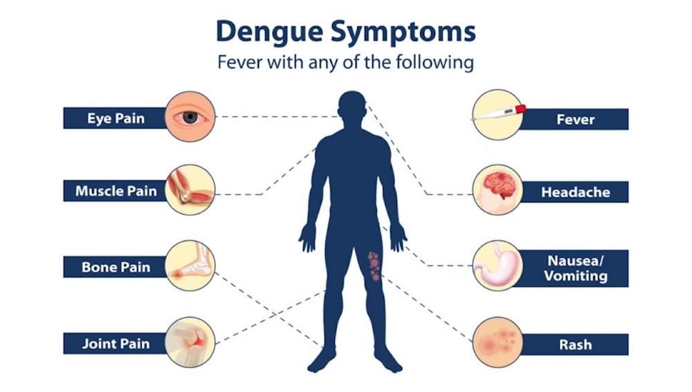 تتشابه الأعراض الأولية لحمى الضنك مع أعراض الإنفلونزا، مما قد يجعل التشخيص صعباً في البداية. الأعراض الأكثر شيوعاً تشمل: